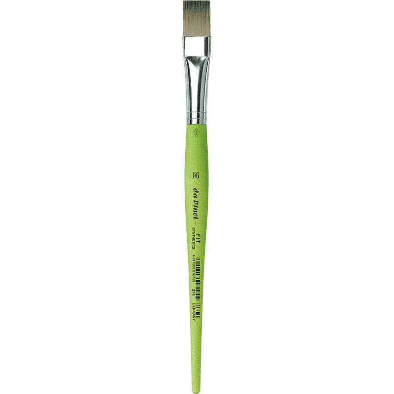 Η σειρά Da Vinci 374 είναι ένα επίπεδο συνθετικό πινέλο από πολύ μαλακές γκρι ίνες, ιδανικό για υδατοδιαλυτά χρώματα όπως ακρυλικά, γκουάς, τέμπερες και watercolours. Διαθέτει κοντή, πράσινη ματ ξύλινη λαβή με ανάγλυφη επιφάνεια, seamless ανθεκτικό αλουμινένιο ferrule και ελαστικές τρίχες που διατηρούν το σχήμα τους ακόμη και σε έντονη χρήση.