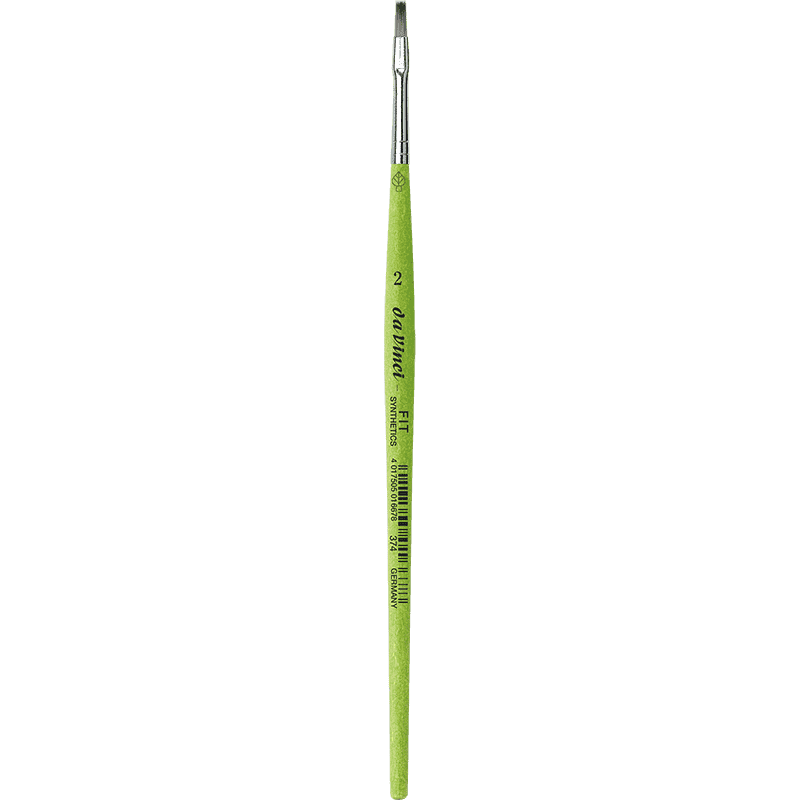 Η σειρά Da Vinci 374 είναι ένα επίπεδο συνθετικό πινέλο από πολύ μαλακές γκρι ίνες, ιδανικό για υδατοδιαλυτά χρώματα όπως ακρυλικά, γκουάς, τέμπερες και watercolours. Διαθέτει κοντή, πράσινη ματ ξύλινη λαβή με ανάγλυφη επιφάνεια, seamless ανθεκτικό αλουμινένιο ferrule και ελαστικές τρίχες που διατηρούν το σχήμα τους ακόμη και σε έντονη χρήση.