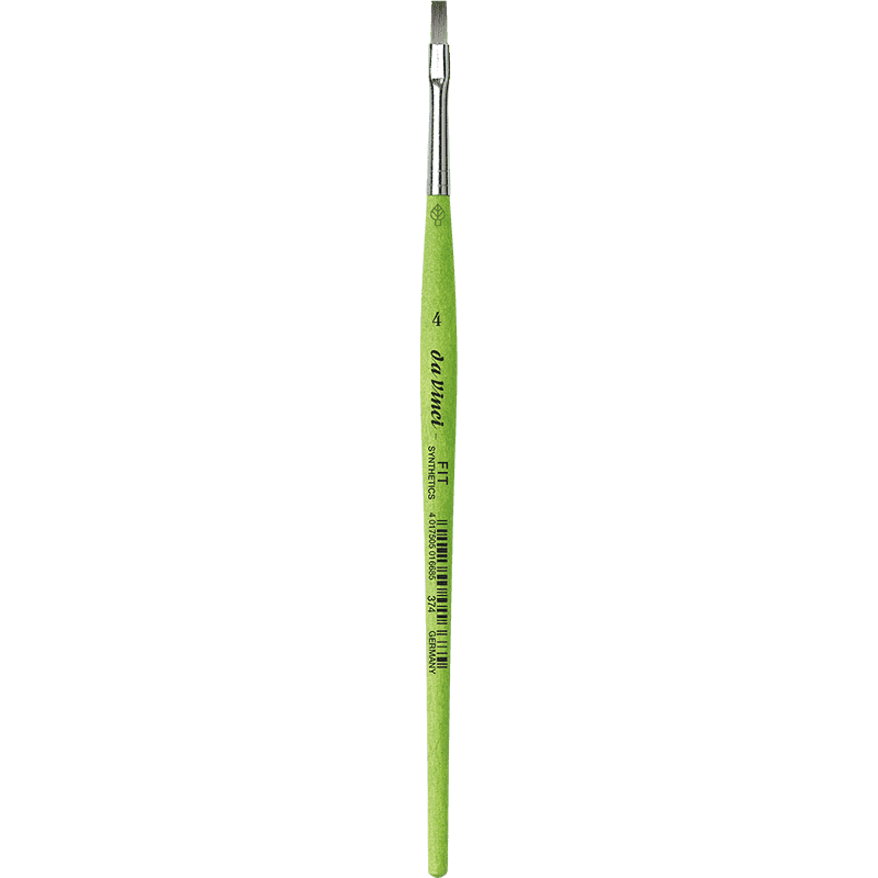 Η σειρά Da Vinci 374 είναι ένα επίπεδο συνθετικό πινέλο από πολύ μαλακές γκρι ίνες, ιδανικό για υδατοδιαλυτά χρώματα όπως ακρυλικά, γκουάς, τέμπερες και watercolours. Διαθέτει κοντή, πράσινη ματ ξύλινη λαβή με ανάγλυφη επιφάνεια, seamless ανθεκτικό αλουμινένιο ferrule και ελαστικές τρίχες που διατηρούν το σχήμα τους ακόμη και σε έντονη χρήση.